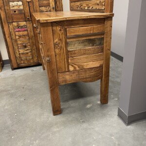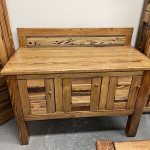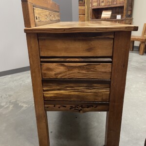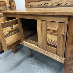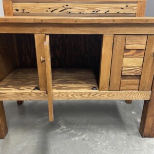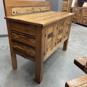 This beautiful and artistic Sideboard is a Canadian-crafted masterpiece made from solid wood. It was created with Bridge wood and BegwoodTM. It features three doors and a unique wooden backsplash in artistic expression. Measurements: H44″, L52.5″, W24.5″