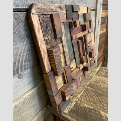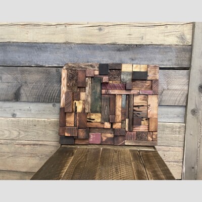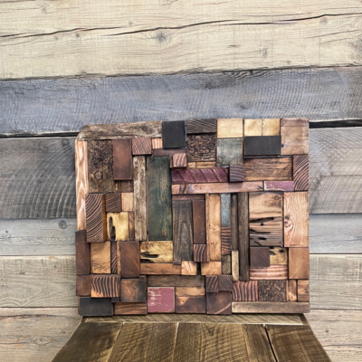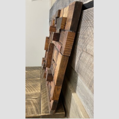 An amazing work of art built in 3-D with pieces of Bridge wood and Begwood™. This feature art piece we call the “Tetris” as one can see the blocks moved and fit together much like the old arcade game. Created by Les Sloan.