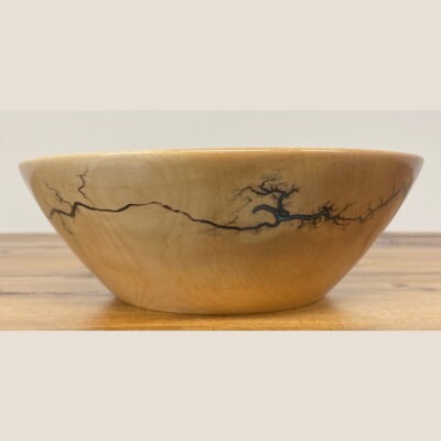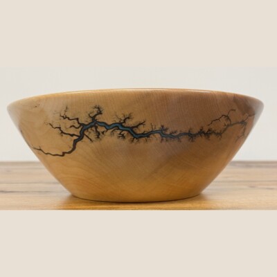 This beautiful bowl is made from reclaimed birch that was to be burned. It is food safe perfect for salads or other delicious foods. (Hand wash only)  The artistic designs are made from electricity that travels in the wood making lightning patterns. Then these patterns are filled with a resin. Measurements are W9.5″, H3.1″, D2.5″. Created by Scott Alexander.